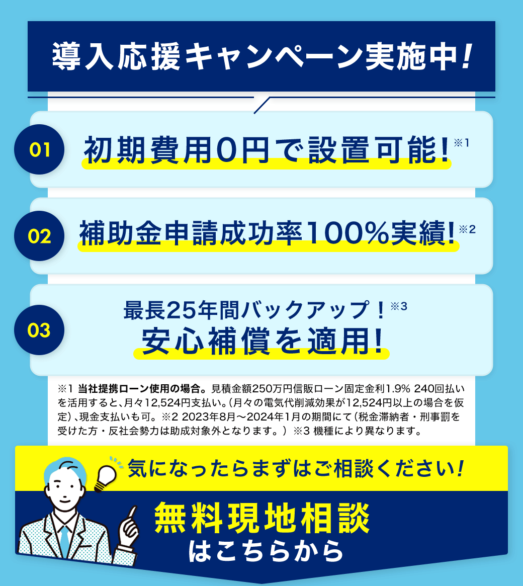 ![]() 0円可能*6 | ![]() 補助金活用で軽減 | ![]() 0円可能*6 |