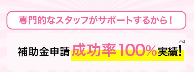 ![]() 補助金申請成功実績100%*1 | ![]() 補助金額100%保証*2 | ![]() 100%の実績 |